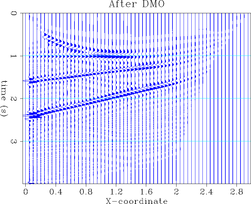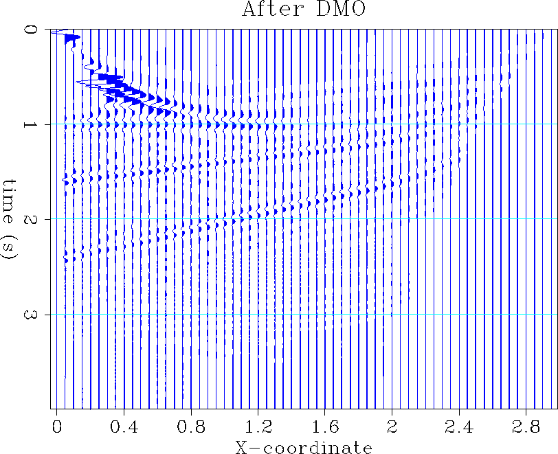 Over the last years, DMO has become a standard step in seismic processing flows. The main reason for this is that it clearly improves the stack for little extra computational cost. Recently, some research showed that the improvement is even more distinct when depth-variable velocity is considered in the DMO process (, , ). However, these new methods are computationally expensive and a constant-velocity DMO is often enough to give an idea of the geological structures involved or improve the velocity analysis. Therefore, a parallel implementation of constant-velocity DMO is natural to reduce the processing time cost.