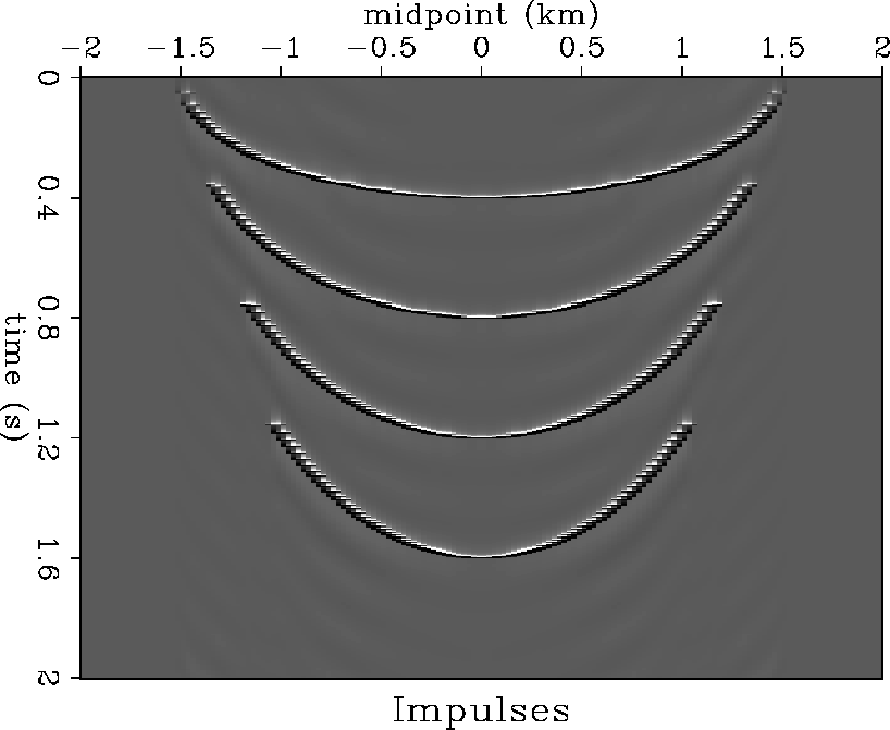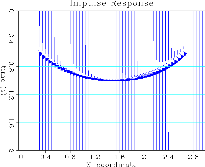 Figure 2 Impulse response of the anti-aliasing integral DMO using triangles. Input spike: 1.0 s; velocity: 2000 ms-1. | ![]() |