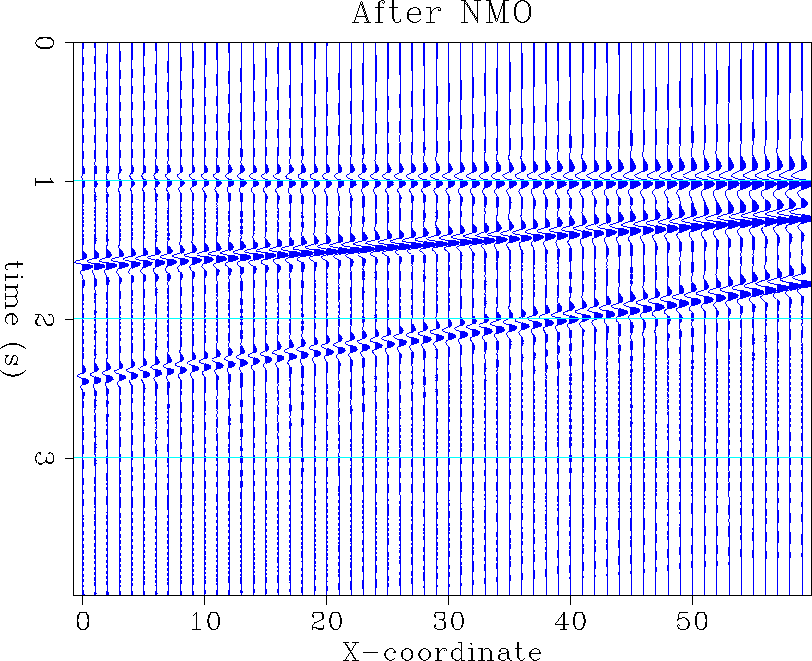 Rule 3. In order to verify the third rule, I used a 3-D synthetic dataset created by David Lumley. Figure (Nmo) shows an NMO-corrected section of the model for a shot located at x = 0. The structure is composed of three planar reflectors: a horizontal reflector showing some amplitude effect (the amplitudes increase away from the source) and two shallow, dipping reflectors (15 and 30 degrees).