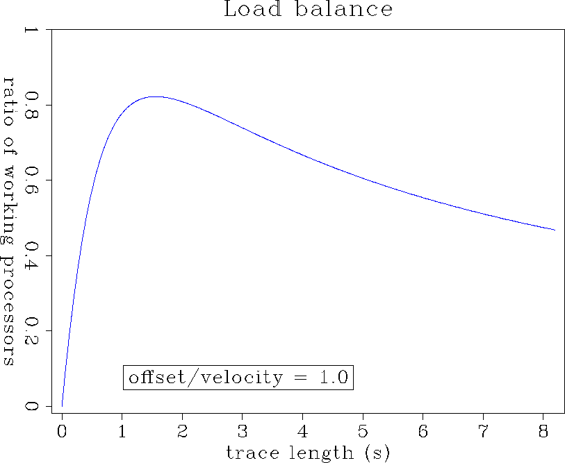 Figure 13 Load balance as a function of the trace length. The optimal load balance of eighty percent corresponds to a trace length which is a function of tm (=2h/v). The bigger tm is, the later the load balance is optimal. Click on the following button to see a movie of the load balance for different values of tm. | ![]() |