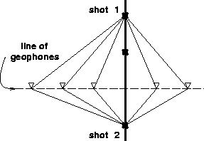 Figure 9 This simple 3-D land acquisition geometry exhibits the non-recurrence of the shot profiles. As opposed to marine surveys, the geophone line does not move along with the shot location. | ![]() |
