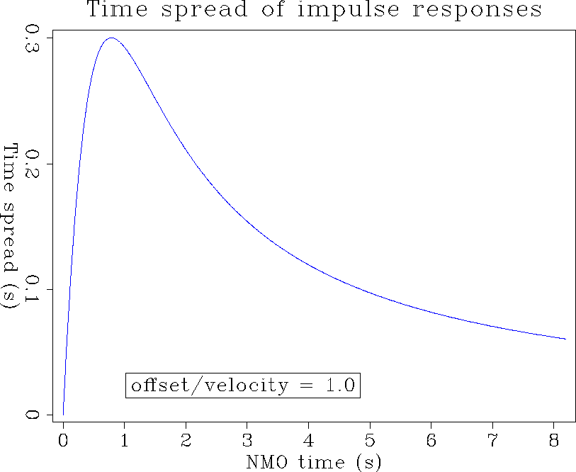 Because the DMO elliptic operator is dip-limited, it does not extend all the way up to the Earth's surface (t=0). The time spread of the impulse response is given by: