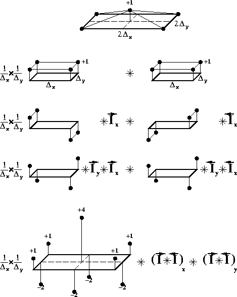 Figure 15 Decomposition of the method for building pyramids. All lines are equivalent: a pyramid function is the convolution of two box functions (line 1 to 2); a box function is the x-integration of an x-opposite-spike square signal (line 2 to 3); an x-opposite-spike square signal is the y-integration of an x-y-opposite-spike square signal (line 3 to 4); the convolution is commutative (line 4 to 5); the convolution of two x-y-opposite-spike square signals is the final nine-spike signal (line 5 to 6). The dimensions | ![]() |