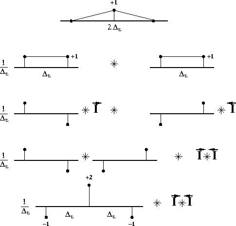 Figure 3 Decomposition of the method for building triangles. All lines are equivalent: a triangle function is the convolution of two box functions (line 1 to 2); a box function is the integration of a two-opposite-spike signal (line 2 to 3); the convolution is commutative (line 3 to 4); the convolution of two two-opposite-spike signals is the final three-spike signal (line 4 to 5). The width | ![]() |