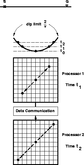 Figure 11 The top-most drawing represents the elliptic dip-limited DMO operator. I assume that the offset line bisects the x- and y- axes on the Earth's surface. Below, the two grids represent the data layout inside the processors. Each processor contains a time slice of data. Processor 1 contains the time slice at t=t0 and performs the data communication across the (x,y) space that corresponds to a vertical shift from t0 to t1. During this time, processor 2 performs the same kind of operation for a vertical shift from t1 to t2. Then, processor 1 sums its output in the output volume and communicates its input to processor 2. The action is then repeated, moving the data across the (x,y) space for a vertical shift from t0 to t2. | ![]() |