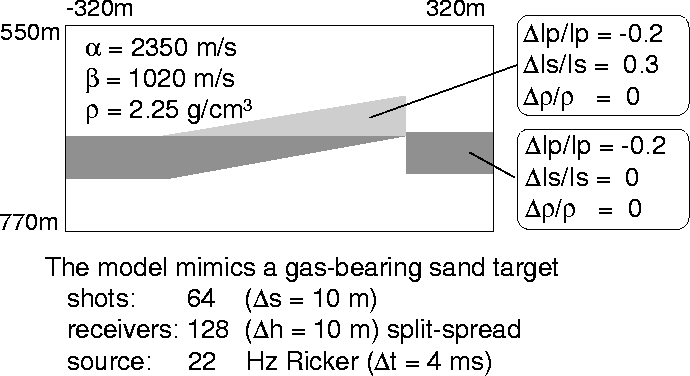 The second model (Figure 7) mimics a fault with a gas-bearing sand target in the upper part, where P-impedance and S-impedance variations occur.