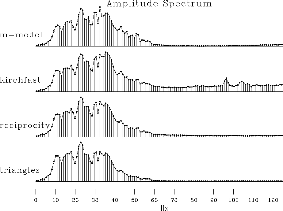 Figure 12 Top is the spectrum of the model. The other plots are the spectra of the migrated images. The second plot corresponds to the modeling/migration without account for antialiasing. The third plot is modeling/migration with the reciprocity antialiasing. The bottom plot is modeling/migration with triangle antialiasing. | ![]() |