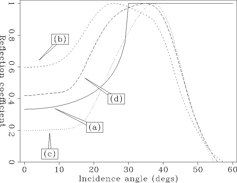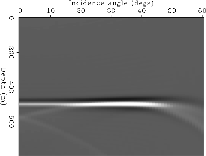 Figure 11 Angle-dependent reflection coefficient as a function of the angle of incidence: (a) the theoretical result, (b) the result of profile imaging with conventional imaging condition, (c) the result of profile imaging with de Bruin's imaging condition, and (d) the result of plane wave synthesis imaging. | ![]() |