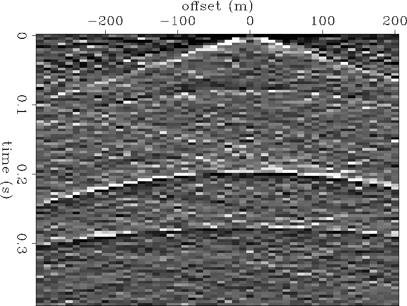 The horizontal bed code shown earlier was easy to adapt to test slightly more complicated models. The left panel of Figure 5 shows a pseudo-shot gather with a point diffractor in the subsurface. Again the kinematics are correct, as they are in the zero-offset section of the same model shown in the right panel of Figure 5. Notice the offset center of the hyperbola in the pseudo-shot gather.
