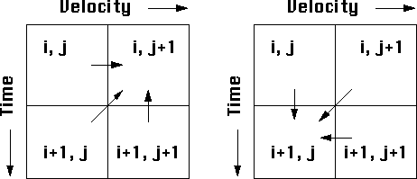 Figure 12 Finite-difference scheme for the velocity continuation equation. A stable propagation is either forward in velocity and backward in time (left plot) or backward in velocity and forward in time (right plot). | ![]() |