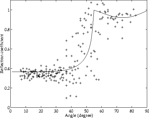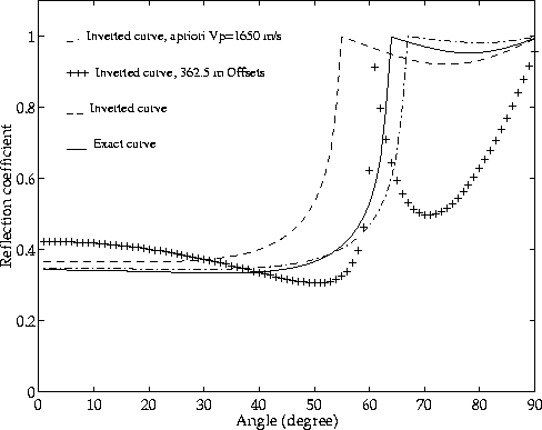 Figure 16 The reflection coefficient calculated from all P-Vz data in the case of 100 m layering is represented by +. The inverted AVO curve is overlain. | ![]() |