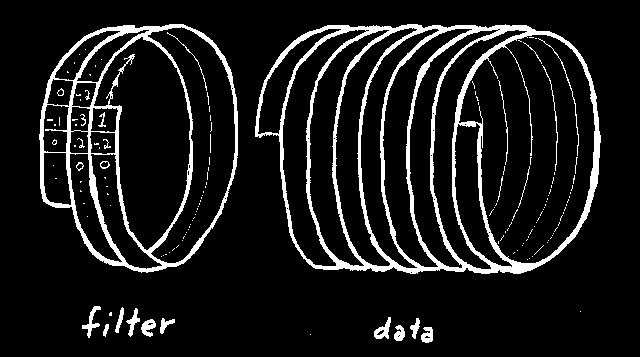 A basic idea of filtering, be it in one dimension, two dimensions, or more, is that you have some filter coefficients and some sampled data; you pass the filter over the data; at each location you find an output by crossmultiplying the filter coefficients times the underlying data and summing the terms. The order in which you produce the outputs is irrelevant. You could compute the results in parallel. Figure 2 shows a filter and some data organized on a helical coil. Since the output values can be computed in any order, we can slide the filter coil over the data coil in any direction. We could, however, slide the filter over the data in the screwing order that a nut passes over a bolt. The screw order is the same order that would be used if we were to unwind the coils into one-dimensional strips and convolve them across one another. The same filter coefficients overlay the same data values if the 2-D coils are unwound into 1-D strips. The helix idea allows us to obtain the same convolution output in either of two ways, a one-dimensional way, or a two-dimensional way. I used the one-dimensional way to compute the obviously two-dimensional result in Figure 1.