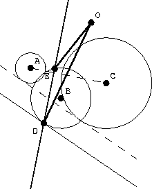 Figure 3 The double solution of the system of equations (7-10). D and E are the intersection points between the circle given by equation (7) and the line given by equation (10). Point O is the previous point on the ray going through B. The distance (OE) is smaller than the distance (OD) and, therefore, D is the next selected point. The middle ray is defined locally by the succession of points (-O-B-D-). | ![]() |