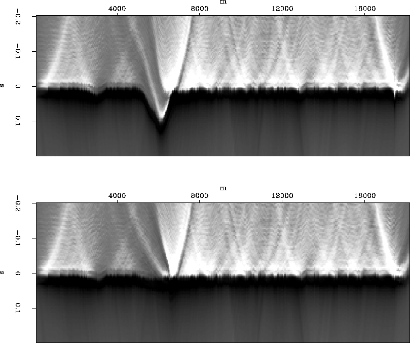 As a test, the correlations can be downward continued to the water bottom. Ideally they should wind up at zero time, but there is noticeable misfit in the deep water data, where there is strong seafloor topography, despite the initial migration, as shown in the top of Figure 1. I calculate a residual depth correction by estimating statics on the misfit, add it to the original depth estimate and downward continue again. The bottom of Figure 1 shows the correlations downward continued to the revised seafloor.