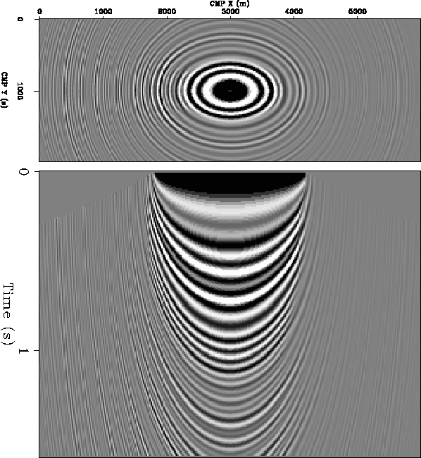 Figure 12 Image obtained by applying Kirchhoff migration with ``standard'' anti-aliasing. Sampling rates are: | ![]() |