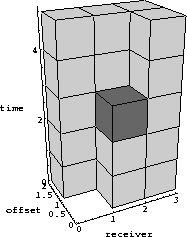 The data are sorted so the recorded traces and the traces to be interpolated are arranged in the input cube in a checkerboard pattern. In the case of missing shots (or dual-source marine geometry), this corresponds to a cube with time, receiver location, and offset coordinates. For comparison with the filter shapes, the input cube is represented by Figure dataPic, with the shaded squares corresponding to empty trace bins. The checkerboard arrangement has the intuitively pleasing quality that every missing trace is surrounded on four sides by a recorded trace. It also poses the problem that there is no densely sampled patch for estimating a filter such as the one in Figure notExpandedAltBW. Any regression equations that have zeroes in them should be dropped. For the filter shown in Figure notExpandedAltBW, this eliminates all the regression equations. To make the filter estimation work, we scale all the axes of the filter by two. This gives the expanded filter shown in Figure expandedAltBW. Convolved across a checkerboard of present and missing data, this filter alternately hits exclusively filled and exclusively empty bins. Because all the axes are scaled equally, the expanded and compressed filters are self-similar and have the same dip information Claerbout (1992).