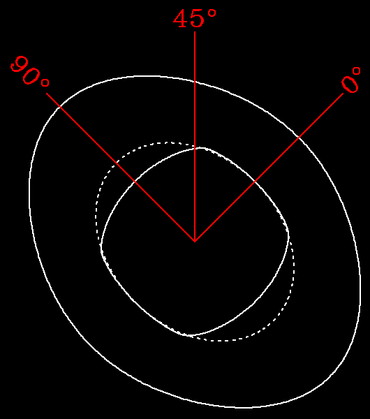 Figure 2: (GIF) (PS) The shapes of qP (outer curve), qSV (inner solid curve), and SH (dotted) wavefronts for the medium used in our numerical model. The 90, 45, and 0-degree labels show the direction of vertical for the corresponding shale-core orientations.
