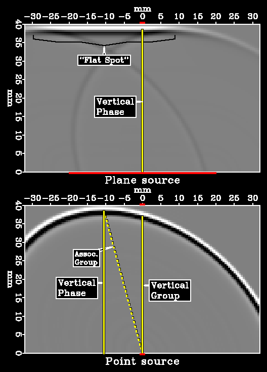 Figure 3: (GIF) (PS) Snapshots demonstrating two "ideal" core-sample experiments. The positions and sizes of the source and receiver transducers are indicated respectively by thick (red) horizontal lines at the bottom and top of the model. Top: a wide-source experiment for measuring vertical phase velocity. Bottom: a point-source to point-receiver experiment for measuring vertical group velocity.