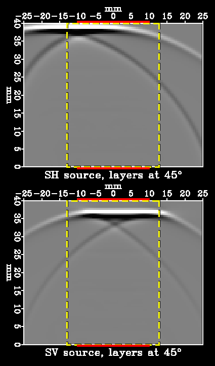 Figure 6: (GIF) (PS) Snapshots showing the behavior of SH (top) and qSV (bottom) waves in our 45-degree simulation.