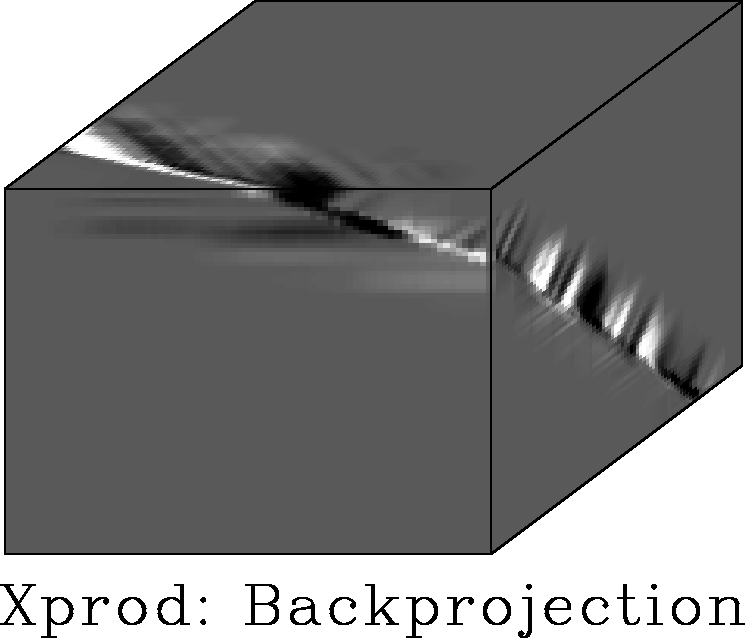 Figure 28 Forward and adjoint of cross-product operator applied to the synthetic image. The back-projected residual of the synthetic test image suppresses the pure plane-wave patches of the image and broadly delineates the input's fault location. | ![]() |