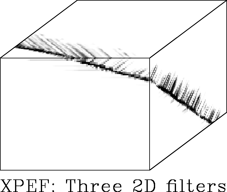 Figure 41 Magnitude of three 2-D prediction error of synthetic image. The fault is broadly outlined by patches of considerable prediction error. | ![]() |