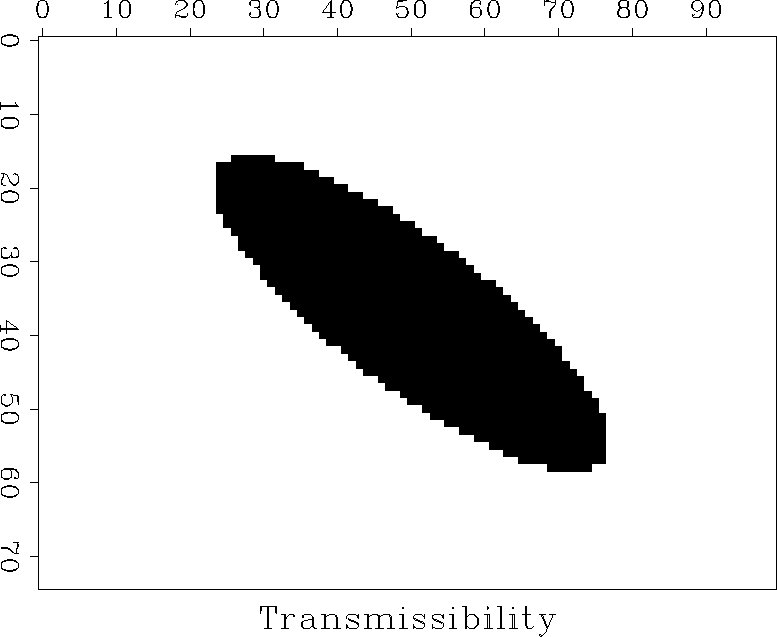Figure 2 shows the transmissibility of a first simple reservoir model. The transmissibility is increased in an elliptic area in the center. Such high transmissibility region may be caused by sand deposits within a paleochannel.