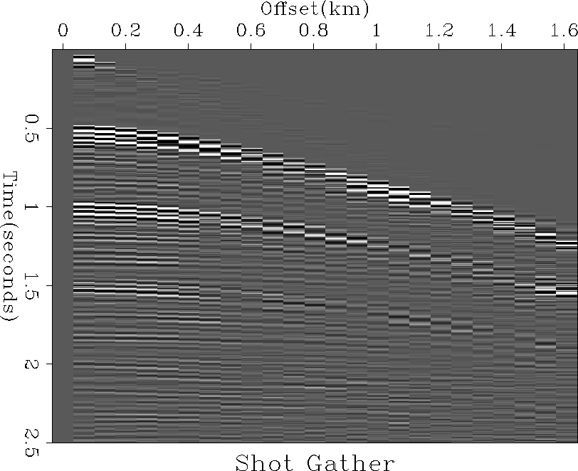 Figure 2 Shot gather. Shot gathers are nonstationary, because they show regions of distinct variance: The early quite zone, the hyperbolic reflections and the noisy coda at the bottom. | ![]() |