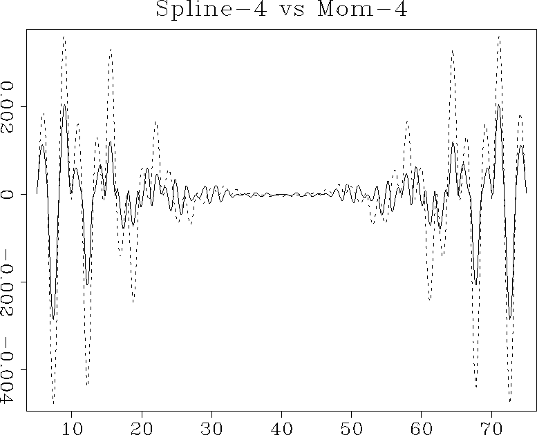 Figure 23 Interpolation error of the third-order B-spline interpolant (dashed line) compared to that of the lower smoothness spline interpolant (solid line). | ![]() |