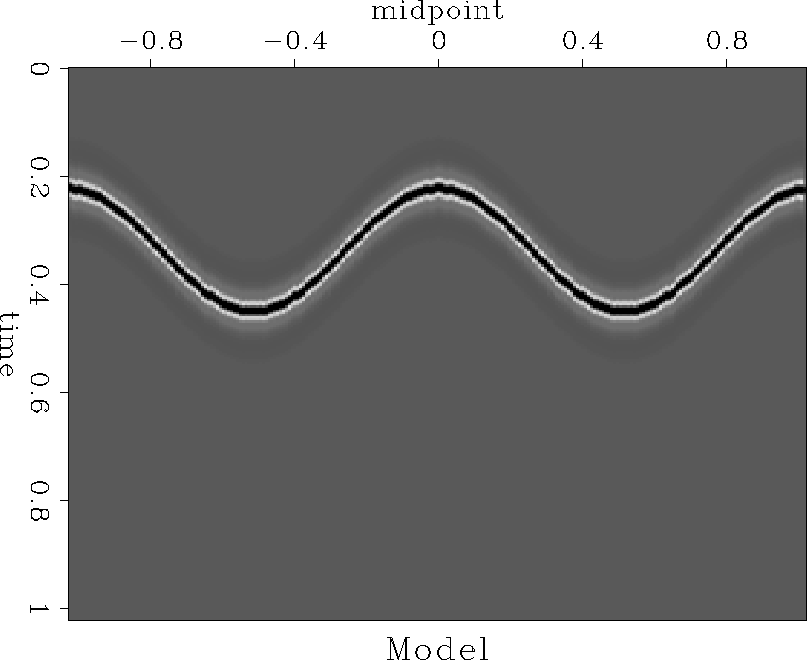 A sinusoidal reflector shown in Figure 1 creates complicated reflection data, shown in Figure 2 before and after the normal-moveout correction. The syncline parts of the reflector lead to traveltime triplications at sufficiently large offset. A mixture of different dips from the triplications would make it extremely difficult to interpolate the data in individual common-offset gathers, such as those shown in Figure 2. The plots of time slices after NMO (Figure 3) clearly show that the data are also non-stationary in the offset direction. Therefore, a simple offset interpolation scheme would also fail.
