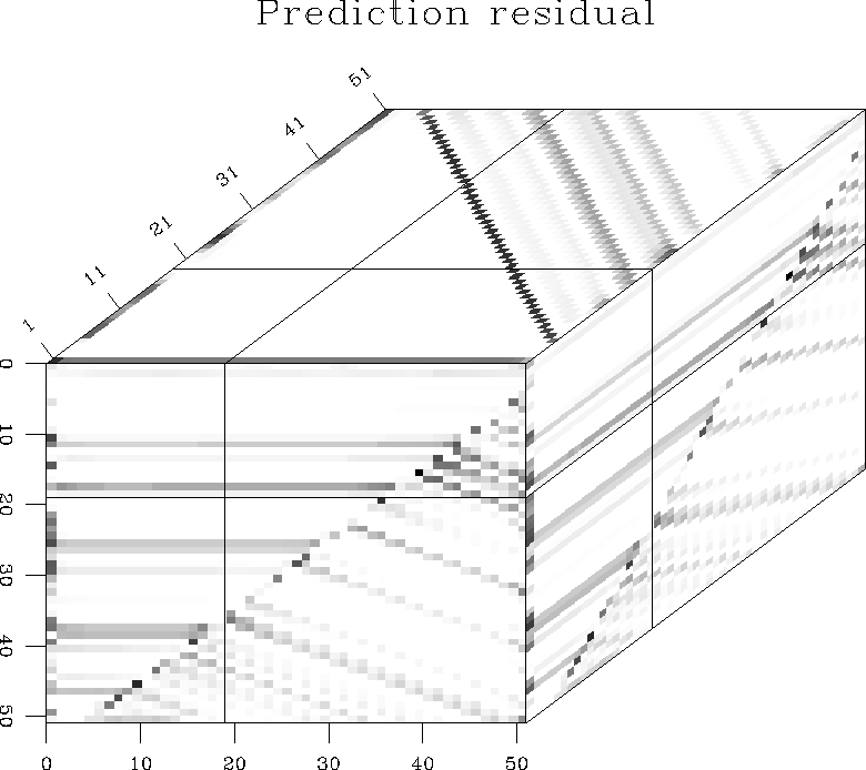 Figure 4 shows a simple synthetic model of two plane waves, separated by a plane fault. The slope estimates for the two orthogonal directions are shown in Figure 5. We can see that the estimation procedure correctly identified the regions of constant slope. Finally, estimating a local 3-D plane-wave predictor by spectral factorization and convolving the resultant non-stationary filter with the input model, we obtain the prediction residual, shown in Figure 6. In the residual, both plane waves are effectively destroyed, and we observe a sharp image of the fault plane. This result compares favorably with results of alternative methods, collected by Schwab (1998).