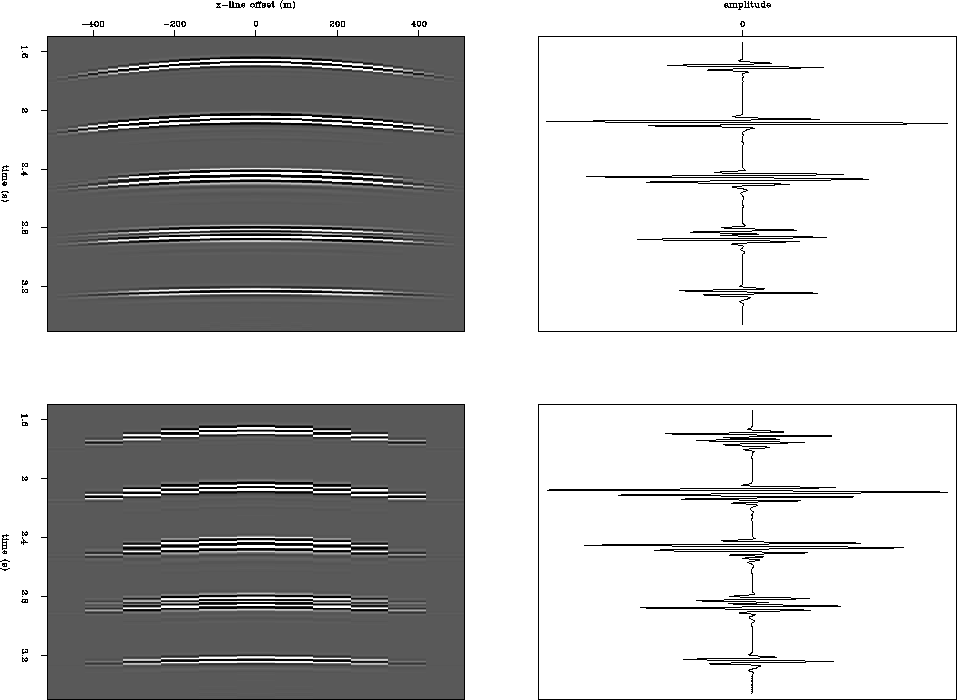 Prior to summation, if we lay out the cross-convoluted traces from left to right, we get an intermediate result, a Multiple Contribution Gather (MCG). Figure 5 shows a 2-D multiple contribution gather and the corresponding summation result.
