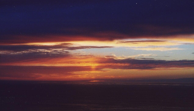 What is really cool about this picture is that the sun is actually bellow the horizon. What you see in the middle is the reflection of the sun from the sea water to the clouds.