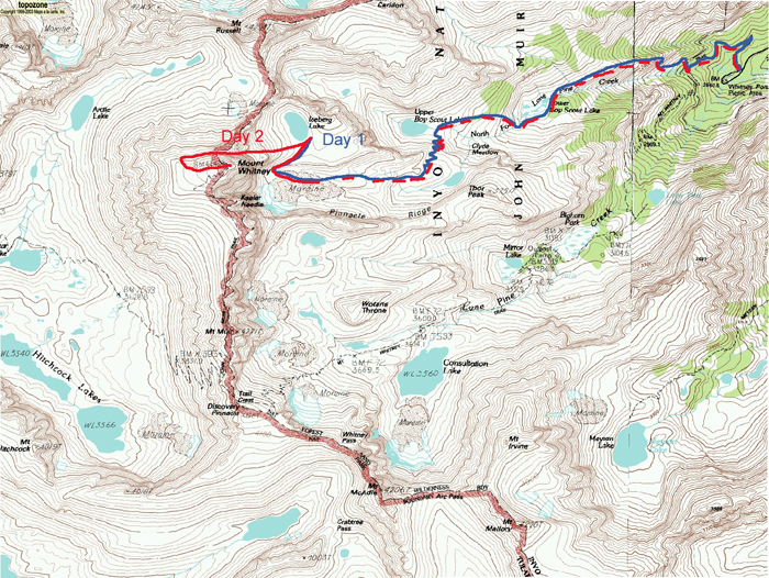 Our route to the summit. First day in blue and second day in red. Our initial itinary was on the Mt Whitney trail, but we managed to get a permit for the Moutaineer's route at the ranger station. It was well worth it...