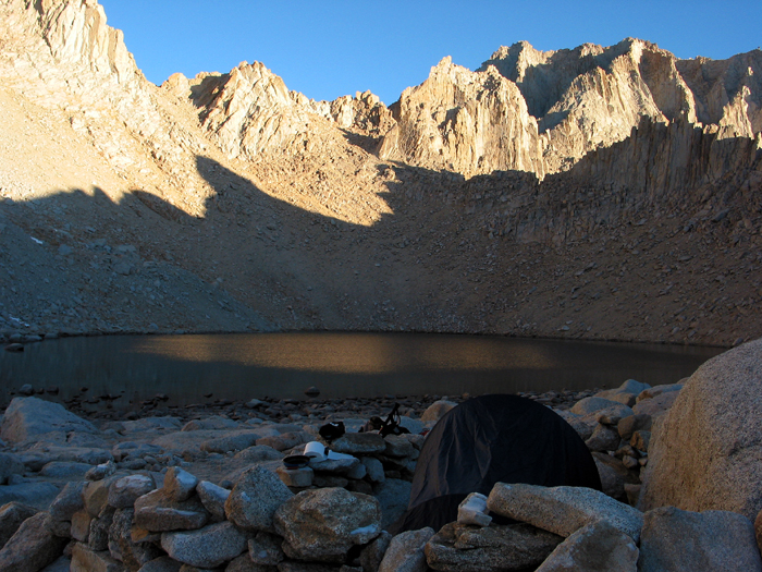 | Our tent next to the Lake. Our water filter was not working: we had to use pills instead. The tent was protected by a wall of rocks. A guy told us that the wind was fairly strong the night before. We did not suffer from it, but we both felt altitude sickness (headaches mainly). |