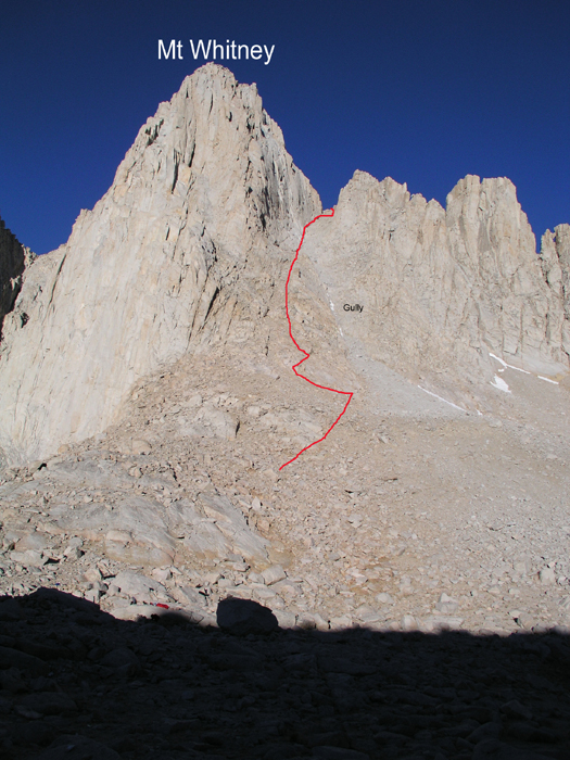 I show our route to the summit. We tried to stay on solid rock as much as possible. The gully on the right is easier to take on the way down. The summit is at 14497 ft, which is 4418 m (this is my highest climb).