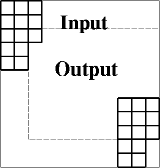 I built a triangular weighting routine tentn() that tapers from the center of the patch of the filter's outputs towards the edges. Accomplishing this weighting is complicated by (1) the constraint that the filter must not move off the edge of the input patch and (2) the alignment of the input and the output. The layout for prediction-error filters is shown in Figure 4.