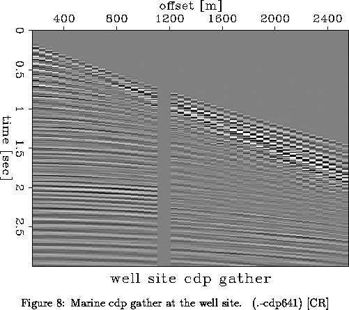 The crucial test however is to compare those curves to actual surface seismic data. Figure 8 shows a CMP gather right at the well site. Figure 9 shows a semblance velocity analysis of that same gather. Overlain are the two estimated velocity curves. The left most is the NMO velocity derived from the partially integrated stiffness log, while the right most curve is the Dix rms velocity. The velocity analysis is using only the raw data with a divergence correction, no other processing is applied. The multiples show up very strong in the semblance panel. Some primaries are visible and derived NMO velocity curves follow pretty close some primary semblance peaks at times less than 2.0 seconds. The Dix rms velocity seems off the semblance peaks to higher values, except for the water bottom reflection and close arrivals. Both curves miss a primary peak at around 1.5 seconds. This is a reflection from a dipping interface. Thus the velocity is shifted towards higher values than predicted using a horizontal layer assumption. Below the target around 2.0 seconds the peaks are shifted again towards higher values. Layers at that depth exhibit progressively steeper dips. The high contrast at the target zone gives rise to strong interbed multiples.