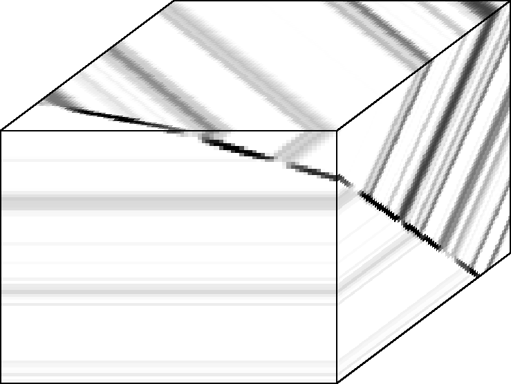 However, applied to oscillatory images, such as the synthetic test case in Figure 15, the gradient magnitude operator indiscriminately amplifies the plane-wave layer boundaries as well as the discontinuity between the plane-wave volumes. Consequently, the plane-wave layers are not suppressed and the central fault is not isolated. The amplitude along the enhanced discontinuity surface varies irregularly depending on the amplitude contrast of the adjacent sedimentary layers.
