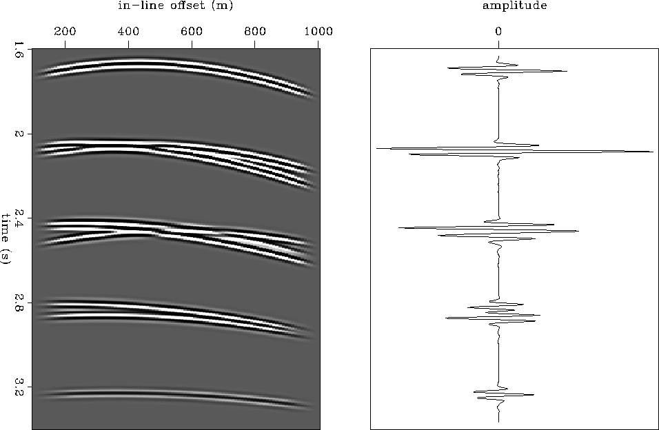 Figure 5 Left: a 2-D MCG. The amplitude has been tapered off to avoid edge effects. Crossing events imply that the multiples are split into different branches. Right: the stacking of the MCG. Notice the effect of the crossing events on the multiple prediction. | ![]() |
