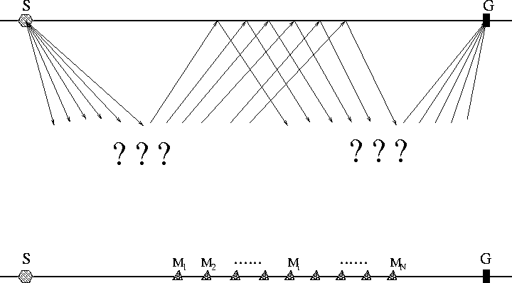 Figure 4 schematically demonstrates the 2-D multiple prediction. In order to predict the multiple from source S to receiver R, we need to cross-convolute all the possible contributing traces marked by Mi in the middle, since we do not know where exactly the multiple reflection occurs on the surface. Then the summation step locates the exact multiple reflection position as long as the contributing traces are densely sampled on the surface.