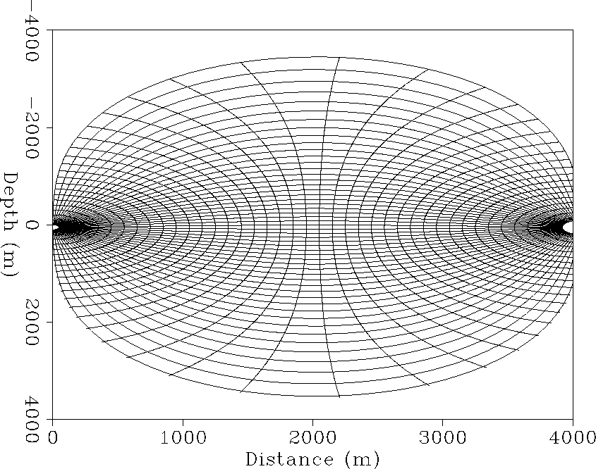 A dipolar coordinate system can be derived from equation 14 by computing the equipotential surfaces and associated field lines. Figure 3 illustrates this for a dipole of 4 km spacing and a
