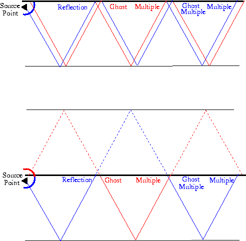 Figure 4 Sketch showing factors complicating modeling wavefield propagation with one-way extrapolation operators. Properly modeling wavefields requires generating multiple arrivals - direct, wide-angle reflections and ghosts - as well as handling the free-surface and source radiation patterns.