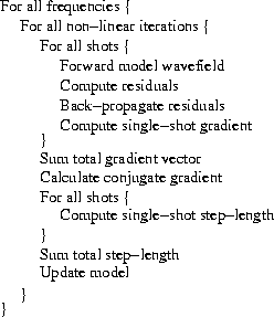 The procedure begins with the forward wavefield modeling (equation 1) for the first non-linear iteration at the first frequency. Wavefield residuals are then computed (equation 2) and back-projected throughout the model volume (the adjoint of equation 1), enabling the computation of the single-source gradient vector (equation 9). This procedure is repeated for all shot points until the total gradient field is computed by stacking single-source gradient profiles. The conjugate gradient direction is then calculated from the current and past gradient vectors (equation 11), and the step length is computed by summing the forward modeling results of the linear perturbation Frech