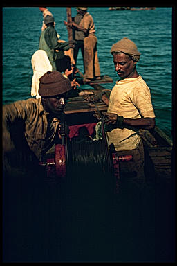 (Planting seismometers in a water depth of about 20 feet.)