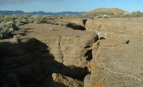 I'm a beginner. My vision is this: Here 760,000 years ago was was the Owens River flowing along at the bottom of its canyon which was then maybe half as deep as it is now. Now it is about 1000' deep and 600' across. Maybe then the gorge was 500' deep. So, one day a giant fissure appears in Long Valley (remember Lookout Mountain?) which explodes upward. Imagine a column of rock shot miles up in the sky. Rock raining down from a mile or more achieves supersonic velocity (according to mv^2 =2mgh, v=300, g=32). (There is little air drag because falling rock drags the air down at almost the same speed). This downdraft of rock and air impacts the earth exploding outward over the landscape in a turbulent fury of scorching boulders demolishing everything in its path. Plenty of the scouring debris lands in the Owens River gorge. Then fiery hot lava pours out of the fissure and covers the landscape to the depth of maybe 400'. Hell on earth! Naturally the gorge fills with lava on top the debris but the lava is pretty viscous so it does not penetrate to the bottom thus leaving cracks for water to percolate along the river's original channel. In following years the rain still fell and the the Owens River still trickled along its original course though now beneath 400' of molten lava.