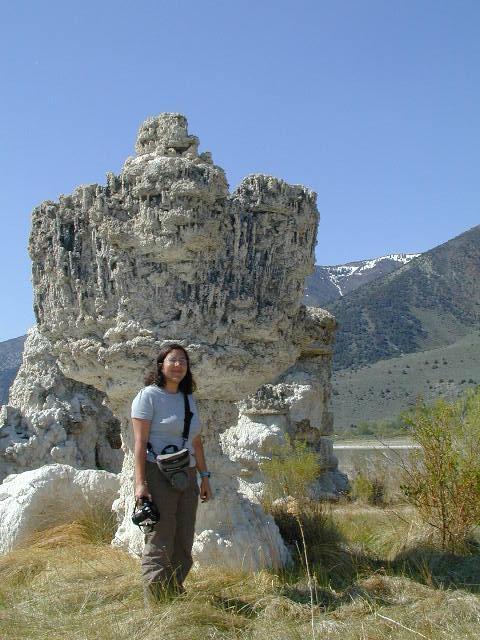 Mono Lake is about 3 times saltier than sea water. Proceeding south we pass a motel on the right and ask the proprietor for permission to walk down a private road to the waterfront. The water was absolutely clear. We could see brine shrimp about a centimeter long. The water has a "slippery" feel to it. Mark Twain claimed Mono Lake water is excellent for laundry. We didn't have time for swimming. Swimming is said to be best on the south shore at Navy Beach.