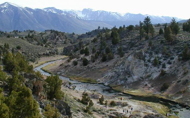 Be sure to bring your swimming suit! Those little dots below on the path and in the water are people. Driving south on 395 we get to the north end of the Mammoth Lakes airport. Turn east and go about three miles. The Hot Creek Geological Site provides public swimming in Hot Creek. This means there are also toilets and changing areas. The water in the creek isn't awfully well mixed so you'll find spots that are too hot and others that are too cold. If you go to where the people are, you'll probably find it almost about right. It seems that the creek is heated from steam entering from below so you can almost feel the rumble as the steam bubbles collapse on encountering the cooler creek water. You might almost feel like you are in a cooking pot.
