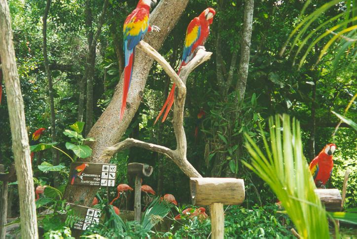 Xcaret is a kind of adventure park south of Cancun. Here you see flamingos and parrots - or are they macaws?