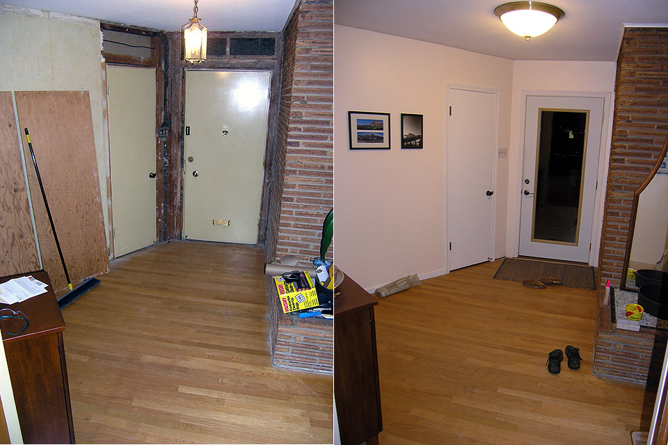 | Foyer after big changes! In the "before" photo, we've already stripped foil wallpaper from the left wall, stripped vinyl tile(?!) from the floor, and removed some termite-damaged (1960's) drywall from over the door. After a new door, drywall, paint, and light, the foyer looks like a new room! |