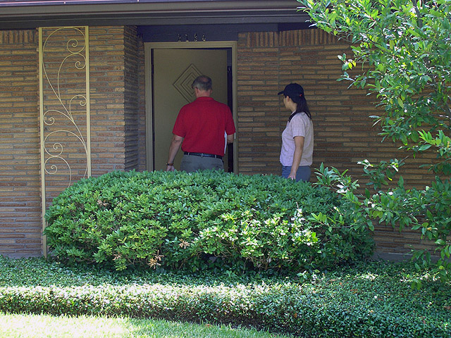Although hideously heavy, the front door did have a unique diamond-shaped design. Robert Gray, our realtor, opens the door for Kim.